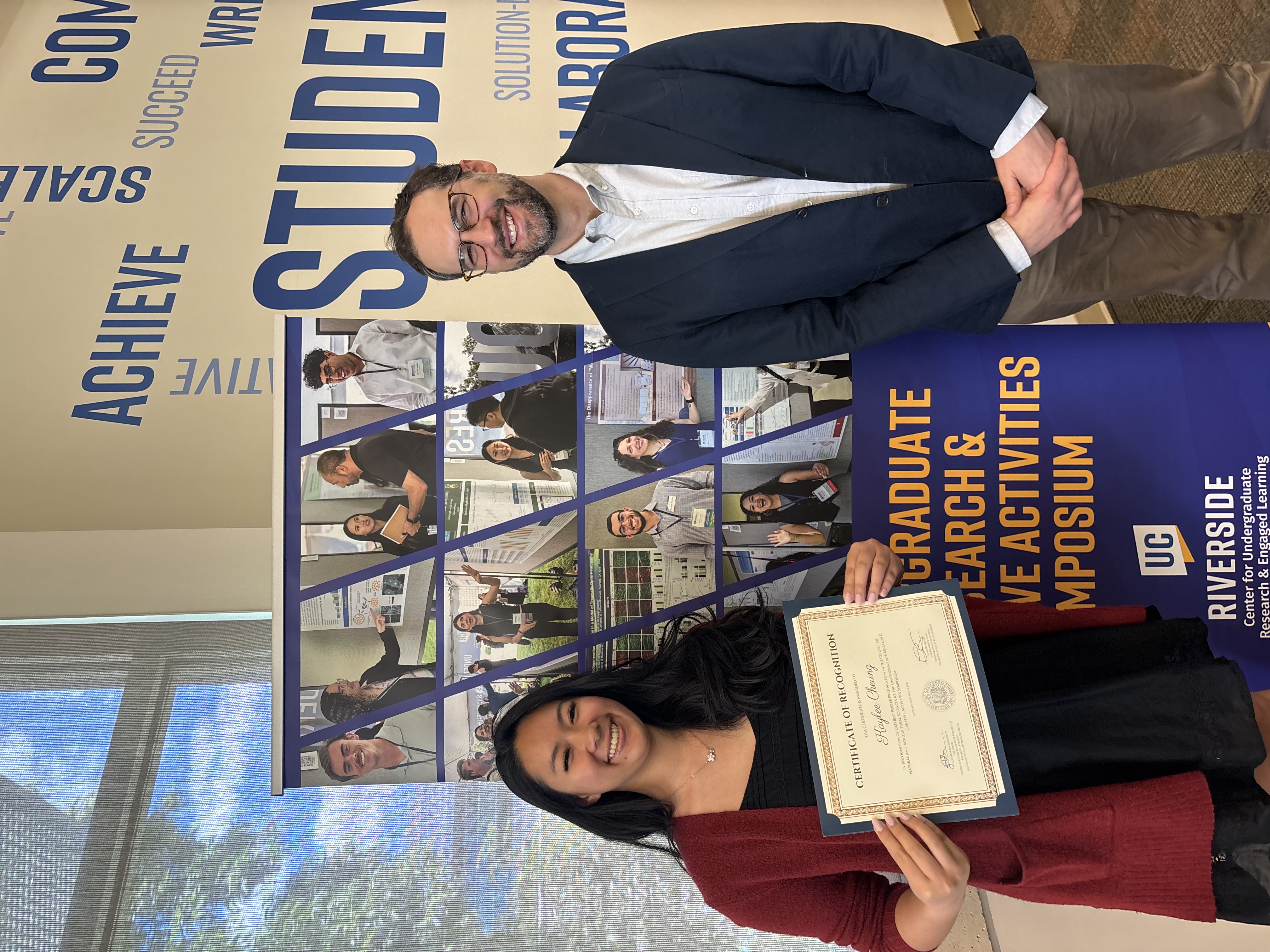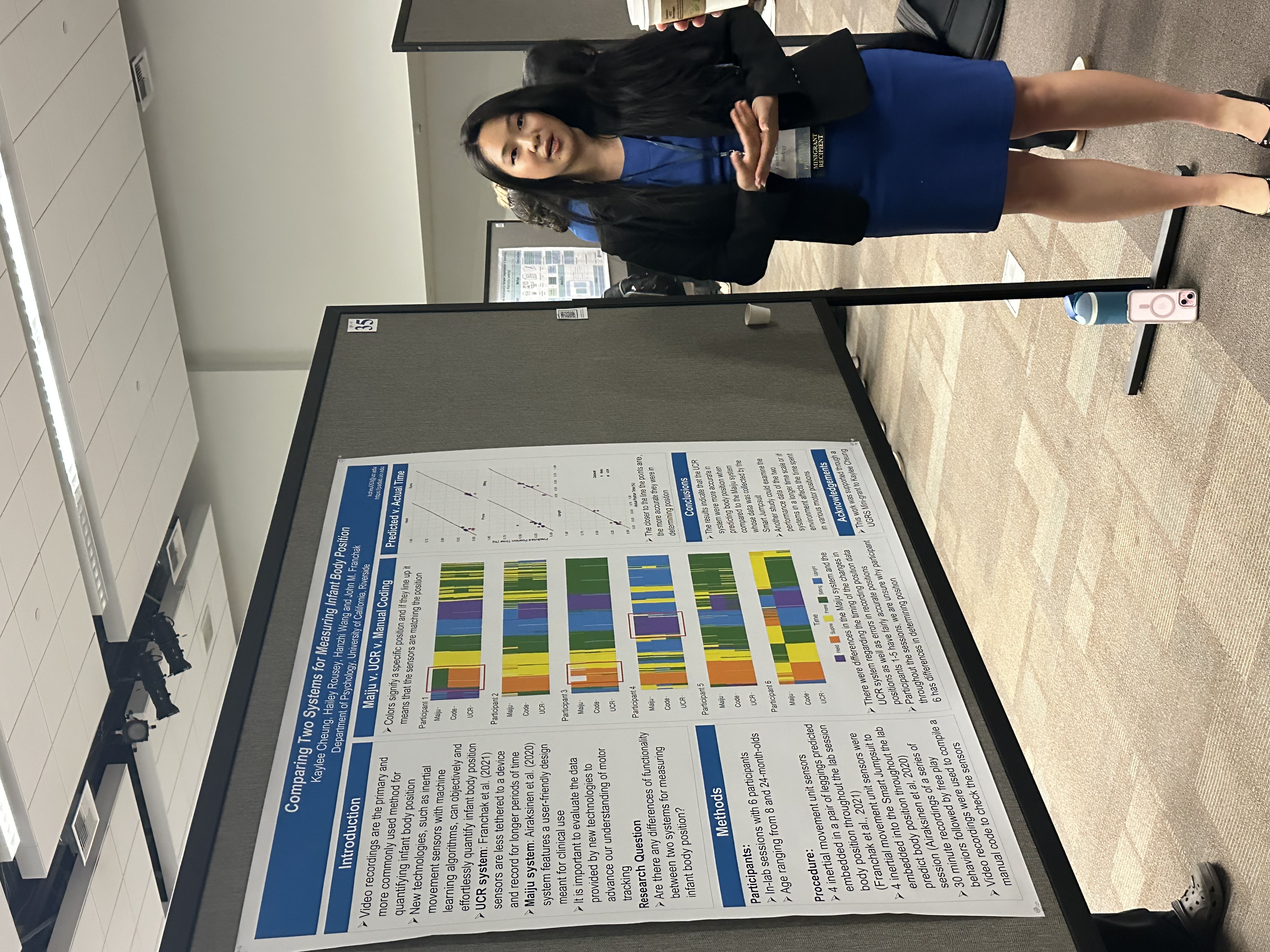 Kaylee Cheung’s Undergraduate Research Symposium Presentation, “Comparing Two Systems for Measuring Infant Body Position”, received the best presentation award for a student from the College of Natural and Agricultural Sciences. Ms. Cheung and Dr. Franchak attended a celebratory luncheon with the Vice Provost and Dean of Undergraduate Education, Louie Rodriguez, and other awardees.